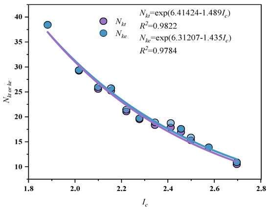 To further probe the functional relation between Ic and Nkt/Nke, the regression analysis was performed on the average values of Ic and the empirically obtained Nkt and Nke within each interval. It can be observed from Figure 9 that R2 is greater than 0.97 and a significant nonlinear relation exists between Ic and Nkt/Nke.