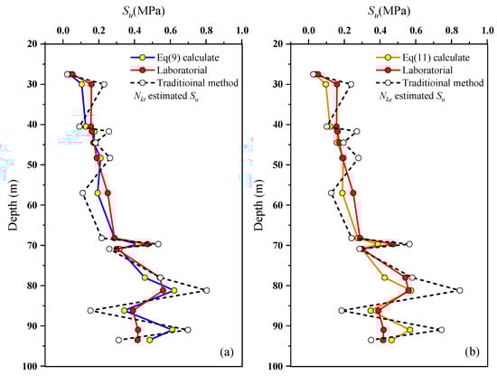 An analysis of the CPTU test result plots in Figure 4 is presented to compare the difference between the traditional method and the new method, which incorporates the soil behavior type index in predicting the distribution of undrained shear strength along the depth direction. In the conventional method, the values of cone factors were kept the same as in the previous section, i.e., Nkt = 20.97 and Nke = 20.51. Table 4 shows the soil cone factors obtained from the soil behavior type index. It is evident from Figure 11 that the undrained shear strength calculated using Equations (8) and (10) proposed in this study consistently has a smaller error than the conventional method. This indicates that the method incorporating the soil behavior type index has significant advantages in terms of prediction accuracy.