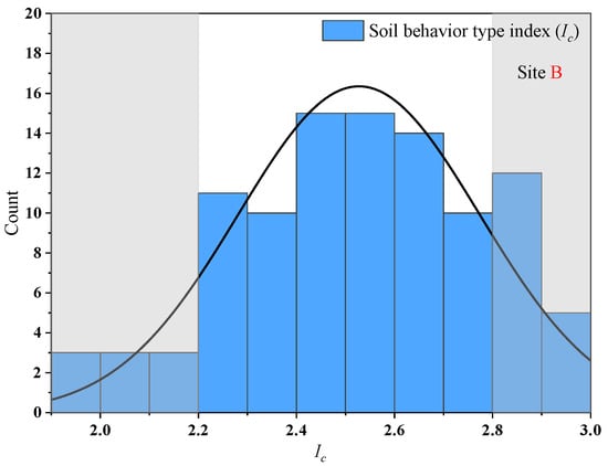 To further validate the reliability of the proposed method, site B was predicted and analyzed. Soil layer data were divided into four groups with 19 data in each group. According to Equation (8), the undrained shear strength of 76 soil layers at site B within the range of the soil behavior index [2.20, 2.8] (see Figure 12) was predicted.