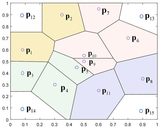 The theory of Voronoi diagrams was initially proposed by the Russian mathematician Georgy Voronoy in 1908 [26]. In this theory, the space can be divided into multiple regions by Voronoi diagrams based on a set of seed points , with each region containing all points closest to its respective seed point. When the seed points cooperate to cover the environment, they can communicate through a network, and global consistency can be analyzed as described in [27]. However, it is important to note that while the seed points are discrete, the Voronoi region corresponding to each discrete point is continuous, as shown in Figure 1. The Voronoi diagram associated with seed point can be represented as follows: [22]