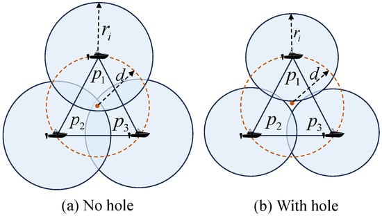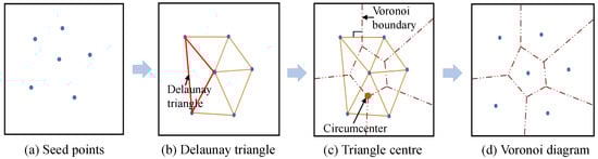 In practice, how to construct the boundaries and vertices of the Voronoi regions has much significance. Delaunay triangle is a special type of triangle where the circumcircle of any triangle does not contain any other points [28]. It is typically used to generate a Voronoi diagram because its edges serve as the perpendicular bisectors of the edges of the Voronoi diagram, the detailed schematic is shown in Figure 2. The circumcenter of the Delaunay triangle serves as the Voronoi diagram vertex. Algorithm 1 illustrates the construction progress.