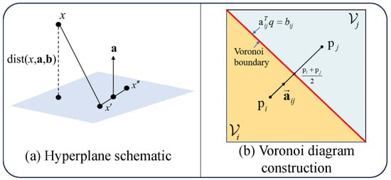 where and are hyperplane parameters used to calculate the Voronoi boundary, as shown in Figure 3b. Voronoi regions based on hyperplane construction can be represented as follows: