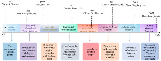 In recent decades, with the advancement in technology, the Voronoi diagram theory has achieved fruitful research results. Figure 4 illustrates the technical development process of the Voronoi diagram. Among the existing results, four types of Voronoi diagrams are widely applied in the field of multi-robotics, namely the buffered Voronoi diagram [31], weighted generalized Voronoi diagram [32], uncertainty generalized Voronoi diagram [29], and discrete Voronoi diagram [33]. A detailed introduction to these types of Voronoi diagrams is given in the following: