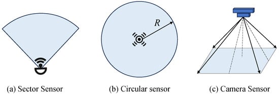 So far, a substantial number of results have been published regarding coverage control research [16,17,18,19,20,21]. Ref. [18] divided the literature on this topic into three main approaches: clustering methods, evolutionary methods, and ensemble-based methods. Furthermore, ref. [19] analyzed the region coverage issue from two aspects: network coverage and network connectivity. Moreover, ref. [19] classified network coverage into three types: blanket coverage, barrier coverage, and sweep coverage. Ref. [20] presented a comprehensive review of visual coverage models in camera networks. The authors provided an overview of the area coverage problem from the perspectives of single-camera sensor planning and computer vision and also presented coverage overlap models for multi-camera networks. However, the authors did not delve deeply into configuration techniques related to coverage rates. Later, ref. [21] reviewed node placement algorithms for sensor network planning. These algorithms primarily focus on summarizing sensor deployment problems from an optimization perspective. These problems are defined as optimization objectives, taking into account coverage range, power consumption, and network connectivity simultaneously. Moreover, four methods are discussed: genetic algorithms, geometric algorithms, potential field algorithms, and particle swarm algorithms.