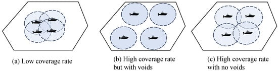 Region coverage is considered one of the hottest research topics in the cooperative behavior of MRSs. It aims to regulate robots to gradually cover an entire area with a certain service, facility, or resource conveyed by the MRS, thereby facilitating the availability or accessibility of those services, facilities, or resources within its coverage expanse. This involves orchestrating the optimal distribution of the MRS within the region by minimizing design costs [10]. Region coverage has widespread applications in various fields. For example, MAUVs are used to complete resource exploration in marine spaces [11]; MUSVs can work together to spray pesticides and fertilizers over farmland in land spaces [12,13]; MUAVs can carry out search and rescue missions in disaster areas in aerial spaces [14,15].