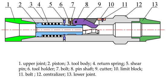 Figure 1 shows a common type of mechanical casing cutting device that is hydraulically driven []. It consists mainly of the upper joint, the piston, the tool body, the return spring, the shear pin, the cutter, the stop block, the centralizer, and the lower joint. The cutting assembly consists of a tool holder, bolt, cutter, and limit block. The cutter shown in Figure 2. It consists of a cutting body and a blade, and the edge of cutting blade is inlaid with cemented carbide to improve the hardness and enhance the cutting performance.