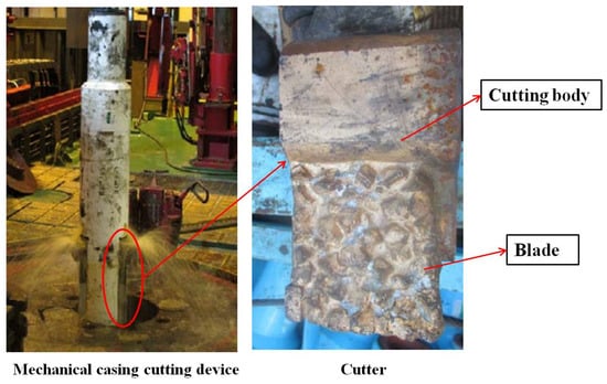 Since the 1960s, offshore oil production has developed rapidly around the world, and more and more offshore oil production facilities have been established [,]. However, the life of offshore oil facilities is usually about 20–50 years [,], according to the international practice of offshore oil production and development, and those facilities need to be dismantled if there is no other use for offshore oil and gas facilities after decommissioning [,,,,]. At present, the main technologies of offshore casing cutting are blasting cutting, chemical cutting, abrasive jet cutting, drill wire cutting, and mechanical cutting []. Mechanical cutting is driven by the hydraulic force of the drilling pump to drive the cutter to rotate and cut the casing, which is widely used for its simple structure, fast operation, good economy, and safety.