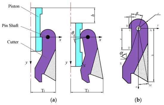 We simplify the process of moving the piston down and pushing the cutter out and establish a simplified geometric model of the piston and cutter: the coordinate system takes the axis perpendicular to the tool center as the y-axis, the line passing through the central point of the pin axis and perpendicular to the y-axis as x-axis, and point N is the contact point between the piston and cutter, as shown in Figure 3a.
