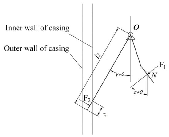 During casing cutting, the cutting torque is provided by the turntable. Simplifying the cutter structure, the mechanical model of the cutter is shown in Figure 4. When the casing is cut under an eccentric condition, according to torque balance, we can obtain the following: