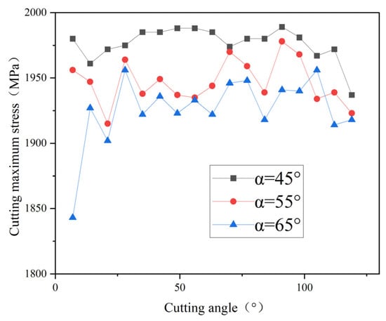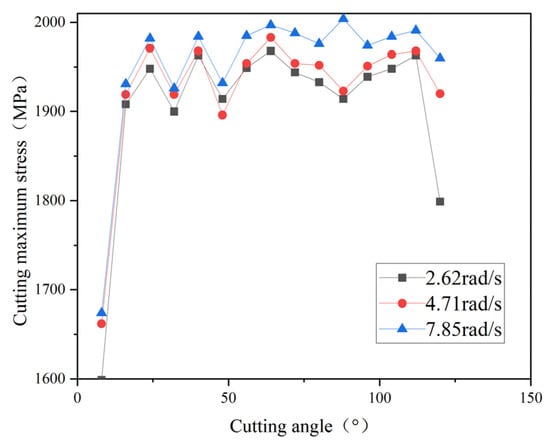 The relationship curve between the maximum cutting equivalent stress and cutting angle at different rotational speeds.