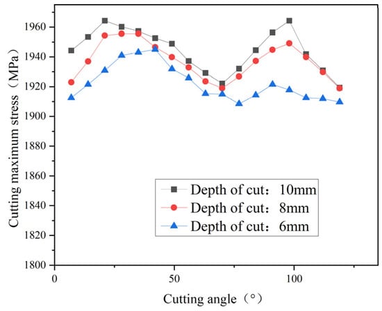 The relationship curve between the maximum cutting equivalent stress and cutting angle at different cutting depths.