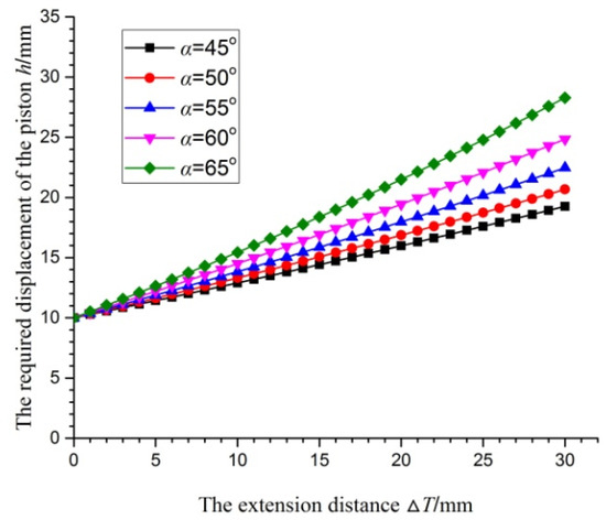 The relationship between the extension distance  and the required displacement of the piston  at different cutter face angles  is shown in Figure 9. From the results, we can know that the required displacement  of the piston increases the extension distance , the displacement  of the piston increases as the angle of the cutter face increases , and  should reach the same distance.