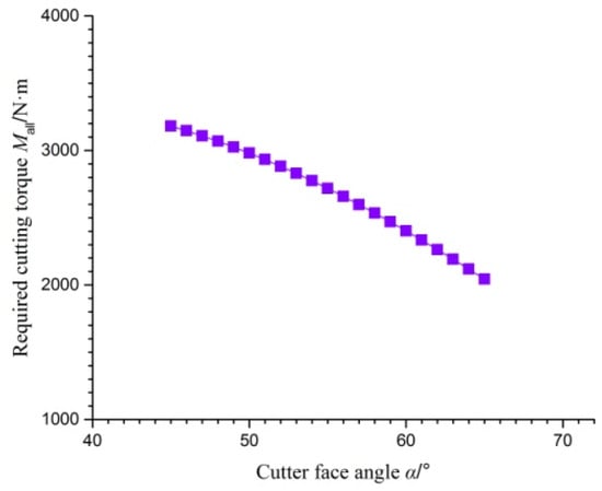 The relationship between the required cutting torque  and cutter face angle  is shown in Figure 10. The results show that the required cutting torque  decreases as the angle of the cutter face increases. The above studies show that the choice of cutter face angle  is very important.
