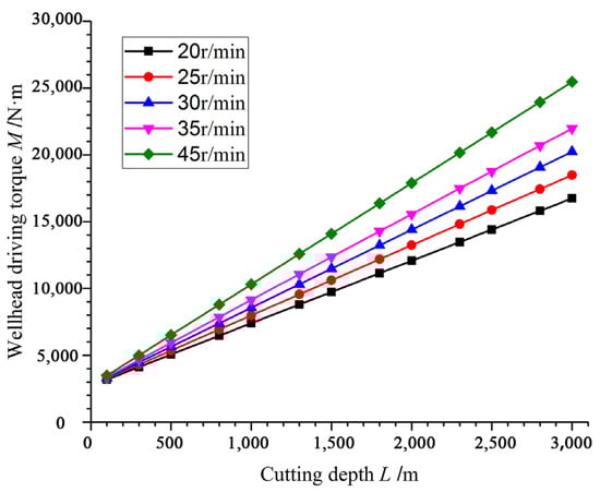 We analyzed the required wellhead driving torque under different drilling revolutions n and different cutting depths L, and the results are shown in Figure 12. It shows that the wellhead driving torque  increases as the depth of cutting increases, and it increases with the increase in drilling revolution n at the same cutting depth. We suggested that when the cutter face angle , the drilling revolution should not exceed 45 r/min, and the cutting effect is the best while considering the influence factors of cutting torque and drilling revolution.