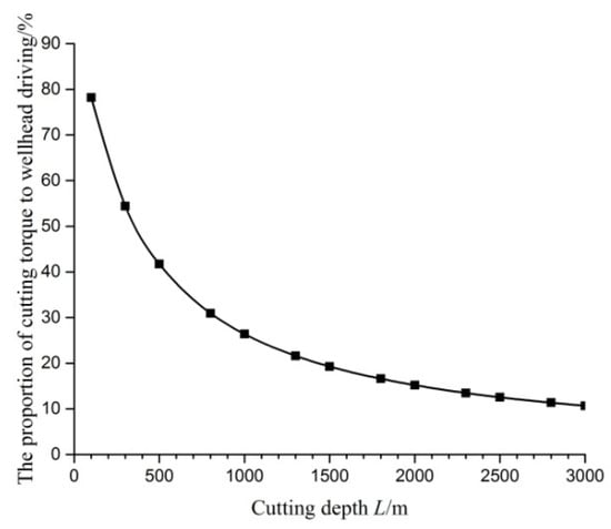 The sudden drop in wellhead driving torque is mainly due to the reduction in the cutting torque during the casing cutting; therefore, the percentage of cutting torque to wellhead torque at different cutting depths is analyzed, and the result is shown in Figure 13. Figure 13 shows that the proportion of cutting torque to wellhead driving decreases as the depth of cutting increases; when the cutting depth exceeds 500 m, the proportion is less than 50%, and the proportion is less than 30% when the cutting depth exceeds 800 m. These results show that it is limiting to use the sudden drop of wellhead driving torque to judge the completion of the casing cutting when the water depth is deep.