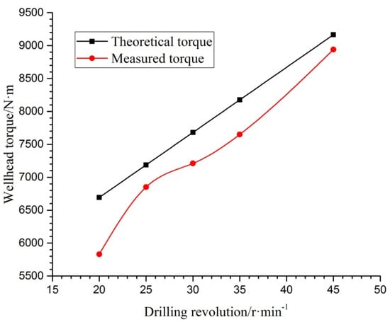 The measured wellhead driving torque in the field was compared with the theory at the same pump stroke and drilling revolution as shown in Figure 16. The related data were calculated during the period of the 2# pump since it is consistent with the theoretical parameters and the drilling revolutions of 20 r/min, 25 r/min, 30 r/min, and 45 r/min.