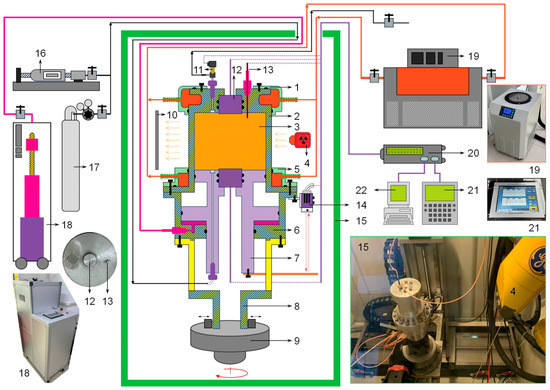 Schematic diagram and physical appearance of the multi-orientation system. 1. Upper cooling jacket; 2. specimen barrel; 3. testing specimen; 4. X-ray generator; 5. bottom cooling jacket; 6. piston sleeve; 7. I-shaped piston; 8. supporting frame; 9. rotation stage; 10. X-ray detector; 11. pressure transducer; 12. acoustic transducer; 13. Pt100 thermometer; 14. laser sensor; 15. scanning room; 16. syringe pump for pore liquid injection; 17. gas cylinder; 18. syringe pump for axial loading; 19. thermostatic bath; 20. data logger; 21. acoustic tester; 22. industrial computer.