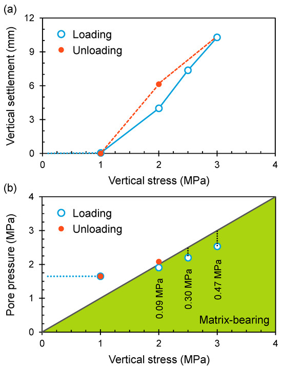 Figure 5 shows the vertical settlement and the pore pressure after deformation stabilization for all loading and unloading steps. The vertical settlement is 0.05 mm when a vertical stress of 1.0 MPa is applied, and the vertical settlement increases to 10.28 mm when the vertical stress increases to 3.0 MPa. After being unloaded back to 1.0 MPa, the vertical settlement completely rebounds to the initial value (i.e., 0.05 mm), but the unloading path does not coincide with the loading path (i.e., a hysteresis). This is largely due to the elastic deformation of free gas under an undrained condition [49]. These characteristics have been further confirmed by the pore pressure evolution (Figure 5b). The initial pore pressure is 1.65 MPa when a vertical stress of 1.0 MPa is applied, and the pore pressure when subjected to a loop of loading and unloading fully recovers to 1.65 MPa. In addition, the pore pressure increases to 2.53 MPa when the vertical stress increases to 3.0 MPa, and the pore pressure becomes increasingly smaller than the corresponding vertical stress when the vertical stress is high enough (i.e., the light green triangle in Figure 5b), indicating that the soil matrix begins to bear part of the vertical stress. The matrix-bearing stress increases from 0.09 MPa to 0.47 MPa when the vertical stress increases from 2.0 MPa to 3.0 MPa, and this is mainly due to the enhanced strength due to the matrix compression [18,27].