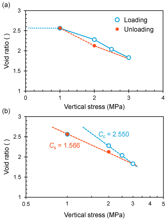 Void ratio after deformation stabilization for all loading and unloading steps on normal (a) and semilogarithmic (b) coordinates. The compression index Cc is 2.550, and the swell index Cs is 1.566.