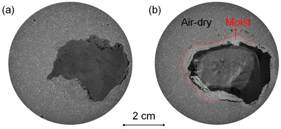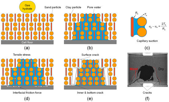 where Ts represents the pore water surface tension; θ is the contact angle and generally assumed to be zero as it is generally very small; Rs is the radius of the meniscus. The suction induces tensile stress along the gas–water interface, and the induced tensile stress tends to pull clayey silt particles together and rearrange the particles, leading to a volume shrinkage of the moist clayey silt (Figure 11d). When the induced tensile stress goes beyond the tensile strength of the clayey silt, cracks due to partial wetting initiate from the upper surface (Figure 11e). In addition, some cracks can develop deep inside the clayey silt matrix toward the lower interface with the help of the interfacial friction [54]. This kind of wetting cracks has been clearly observed in the lower matrix after methane hydrate dissociation and prior to being loaded under higher vertical stresses (Figure 11f). In summary, it is the soil suction that mainly influences the development of tensile stress and induces the initiation of wetting cracks.