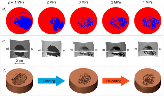 Two-dimensional and three-dimensional X-ray CT images of the specimen after deformation stabilization for all loading and unloading steps. (a) Two-dimensional images of a cross section in the lower half of the specimen. Gas cavities are colored in blue, and the clayey silt matrix is colored in red. (b) Three-dimensional perspective views of the whole specimen. Gas cavities are in black, and the clayey silt matrix is in grays. (c) Three-dimensional opaque views of the lower half of the specimen. The clayey silt matrix is colored in brown. The symbol p represents the vertical stress.