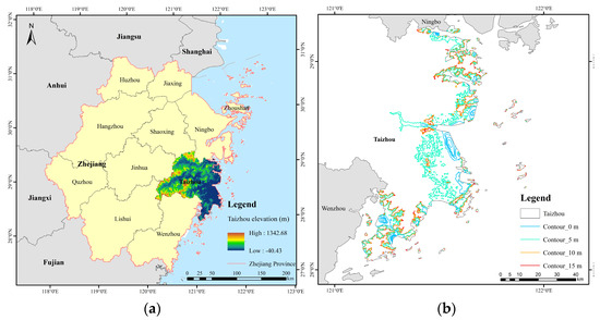Taizhou (28°01′ N~29°20′ N, 120°17′ E~121°56′ E) is located in the central coastal area of Zhejiang Province (Figure 1a, the contour line of the coastal area is shown in Figure 1b), with a total land area of 10,050.43 km2 and a territorial sea and internal water area of approximately 6910 km2. The mainland coastline is about 726 km long, with 921 islands [34], and the natural coastline retention rate is about 40% [35]. The terrain is high in the west and low in the east, with the plain accounting for 22.4%, and the elevation in the coastal area is generally low, with a minimum value of −40.43 m [34]. The characteristics of a long coastline and low coastal terrain make Taizhou one of the regions with the highest frequency of storm surges and the most serious disasters in Zhejiang Province. It is recorded that many strong typhoons have landed in Taizhou throughout its history and caused major storm surge disasters, even leading to casualties. Among them, the “9711” typhoon storm surge caused the biggest economic loss of a storm surge disaster between 1949 and 1997. The NO. 1909 “Lekima” typhoon storm surge caused the most serious storm surge disaster in Zhejiang Province from 2000 to 2019. The direct economic losses of Zhejiang Province totaled CNY 7.622 billion, of which Taizhou lost CNY 4.597 billion, accounting for 52.68% of the total [36]. In addition, the coastal areas of Taizhou are affected by sea level rise and land subsidence, and the threat of storm surge disasters is becoming increasingly serious. Therefore, it is urgent to study its countermeasures for disaster prevention and mitigation.