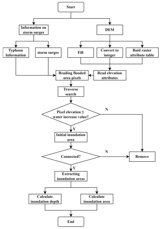The input of the method includes storm surge water increase information and the DEM. The DEM is subject to relevant preprocessing, including filling in depressions, converting to integers and building grid attribute tables, and then the DEM elevation attribute is read. Based on the storm surge water increase data and DEM elevation data, the first conditional sentence (whether the pixel elevation ≤ the water increase value) is interpreted for all pixel points in the whole study area. When the elevation value is lower than the storm surge water increase value, these pixels are stored in flooded areas; otherwise, they are in non-flooded dry areas and removed. All stored pixels form the initial flooded area, and then the second conditional statement (whether connected) is performed to determine the connected area. If a flooded area is not directly or indirectly connected to the coast, that is, the area may be an inland valley or other terrain, which belongs to the flooded misjudgment area, remove it; otherwise, retain it. Finally, all the inundation areas that meet the conditions are extracted, including the storm surge inundation areas estimated by the method. Adding the area attribute and the water depth attribute can further calculate the area of the whole submerged area and the submerged depth of each pixel point, and output the submerged range and depth map of the storm surge. This method can be implemented through the ArcGIS model builder or ArcPy program.