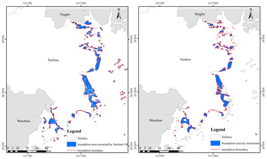 Figure 3a is the storm surge inundation range extracted based on the Sentinel-1B image, Figure 3b is the storm surge inundation range estimated based on the improved passive inundation method and the red line in the figure is the boundary line of the range. In terms of spatial distribution, the extracted inundation range and the estimated inundation range of mainland Taizhou are consistent. In the extracted inundation map, the water body is dense and scattered, while in the estimated inundation map, the water body is continuous and planar. The reason is that the surface is simplified in the estimation process, which mainly considers terrain and elevation, and does not consider the influence of the underlying surface (such as surface buildings and vegetation). However, in the island region, there is a big difference between the extraction of the inundation range and the estimation of the inundation range. In the estimate of inundation range map, most of the inundation area of the island has not been estimated. The reason is that the island area of Taizhou is mostly less than 1000 m2, and the spatial resolution of the DEM data used in this paper for the estimation of inundation range is 30 m. Some islands appear as only one pixel in the estimation process. At the same time, because the landform of the island region is mountainous and hilly, the pixel elevation value is also large, and it is easy to be judged as a non-inundated area, resulting in a deviation in the inundation estimation. After calculation, the extracted inundation area is 399.91 km2, the estimated inundation area is 318.68 km2 and the MAPE is 20%, indicating that the estimated inundation range is in good agreement with the extracted inundation range. Therefore, the improved passive inundation method in this paper is more reliable in the estimation of storm surge inundation characteristics.