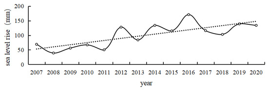 The coastline of China is long, and the GMSL has had a great impact on China’s coastal areas. From 2007 to 2020, the sea level of all coastal provinces in China showed an upward trend, with an increased rate from 2.5 mm/a to 3.4 mm/a, which is higher than the global average during the same period. The annual changes in sea level in Zhejiang Province from 2007 to 2020 are shown in Figure 4. The sea levels in 2007 and 2020 were 69 mm and 134 mm, respectively, and increased by 65 mm over 14 years. It is expected that in the next 30 years, China’s sea level will rise by 55~170 mm compared to 2020, and by the end of this century, it will rise by 0.6~1.1 m [32].
