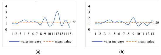 To analyze the mean level of storm surge disasters in Taizhou from 2011 to 2021, this paper collates the water increase data of 26 storm surges that affected Zhejiang Province in the Marine Disaster Bulletin of Zhejiang Province, including 15 storm surges in Taizhou. As shown in Figure 5a, the data are relatively centralized as a whole, but there are maximum and minimum water increase values. In order to obtain the reasonable mean value of storm surge water increase in the past 11 years, the impact of extreme storm surges is eliminated, and the mean value of the remaining data is calculated. As shown in Figure 5b, after removing the extreme values, the data are more evenly distributed on both sides of the mean value. After calculation, the mean value of the storm surge water increase data in Zhejiang Province is 1.2 m, so 1.2 m is set as the general water increase scenario of storm surge.