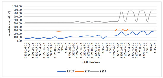 To analyze the impact of RSLR on the inundation characteristics of storm surge, the improved passive inundation method proposed in this paper is used to estimate the inundation characteristics of future storm surges, so as to analyze the changes in the inundation characteristics of storm surge with different water increases under different scenarios of RSLR in 2030, 2050 and 2100, and to estimate the inundation risk of future storm surges. The estimated inundation area of storm surge under each scenario is shown in Table 8 and Figure 6.