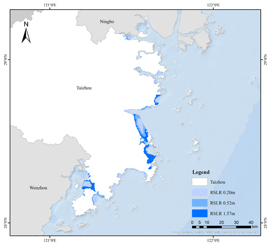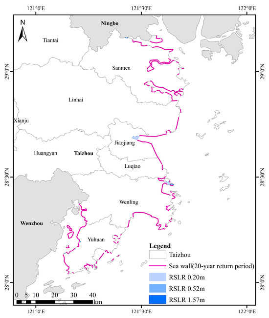 Considering only the scenario of RSLR, the maximum possible RSLRs of 0.2 m, 0.52 m and 1.57 m in 2030, 2050 and 2100 in Taizhou are expected to result in the inundation areas of 111.67 km2, 158.32 km2 and 277.80 km2, respectively. In this regard, the existing 20-year return period of the sea wall can be resistant to RSLR.