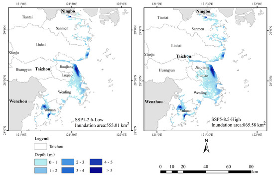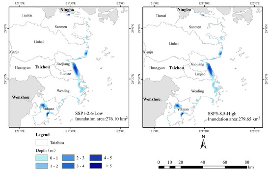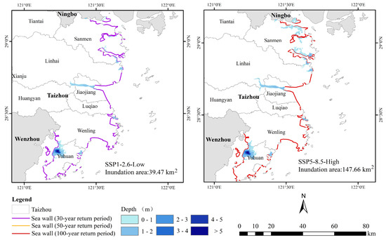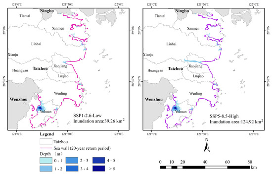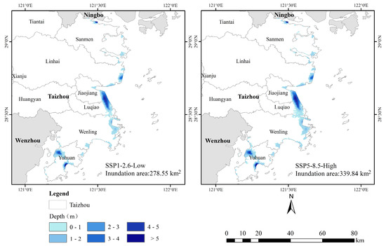 As shown in Figure 16, compared with the 36 scenarios of the RSLR superimposed with the historical general storm surge, the estuary area of Sanmen County and the northeast area of Yuhuan have obvious inundation areas. The reason is that these areas are currently dominated by natural coasts. Without seawall defense, when the storm surge reaches a certain height, inundation will occur. If the storm surge continues to rise, the inundation range will continue to expand, and even spread to the coastal section with seawall protection, especially the northeast coast of Yuhuan City. In addition, the historical maximum storm surge itself has a large increase in water, and a small rise in relative sea level may also significantly increase the inundation area of storm surge. For example, under the scenarios of SSP1-2.6-Low and SSP1-2.6-Medium, the RSLR values of the two are only 0.05 m different, while the inundation area of storm surge is 6.5 km2 different. On the whole, after considering the current 20–year return period seawall, although there is still obvious storm surge inundation in some areas, compared with the situation without a seawall, the inundation area has decreased by more than 93%. It can be seen that the protection effect of the current return period seawall is good.