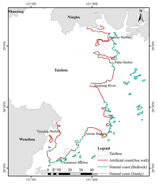 The natural coasts of Taizhou include bedrock coasts and sandy coasts. The bedrock coasts are composed of rocks, characterized by a winding and steep coastline. Because the bedrock coasts generally have a large elevation and strong stability, they have a certain defensive capacity against storm surges. In addition, the areas near bedrock coasts are usually uninhabited and have no important facilities, so even if they are submerged by storm surge, they will not cause disaster losses.