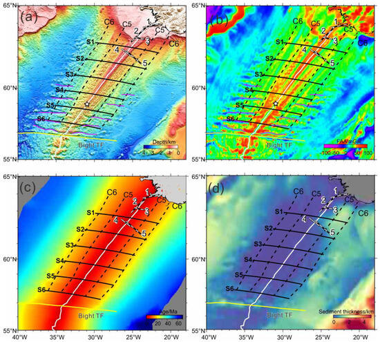 The Reykjanes Ridge is located between the Bight Fracture Zone and Iceland (Figure 1) and belongs to the slow-spreading mid-ocean ridge [12]. At about anomaly 24 (~55 Ma), the Reykjanes Ridge began seafloor spreading and connected with the already existing Mid-Atlantic Ridge and the Labrador Sea spreading center in a ridge–ridge–ridge triple junction [12]. The Reykjanes Ridge kept orthogonally spreading without transform faults as a linear geometry until anomaly 17 (~37 Ma) when the spreading direction abruptly changed ~30° as the Labrador Sea spreading creased [13,14]. At anomaly 17, the Reykjanes Ridge became the boundary between the North American and Eurasian plates, and the elimination of the triple junction initiated the Bight Fracture Zone [15]. This tectonic reconfiguration also led to the breakup of the linear spreading axis and the formation of a series of ridge segments perpendicular to the new spreading direction [13]. After the establishment of the segmented plate boundary of the Reykjanes Ridge, the stair-step ridge-transform configuration was eliminated from north to south and became a linear obliquely spreading ridge [12]. During the reconfiguration process, the Reykjanes Ridge formed the diachronous V-shaped crustal ridges resulting from the melt supply flowing outward from the mantle plume beneath Iceland [16]. At about anomaly 6 (~20 Ma), the Iceland hotspot crossed Greenland into the Atlantic Ocean near the ridge axis at anomaly 5 (~10 Ma). Subsequently, it moved eastward relative to the Reykjanes Ridge [17].
