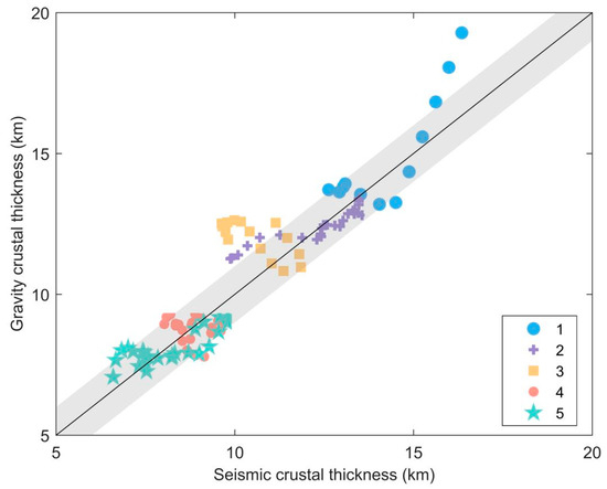 The crust–mantle density contrast is a key factor controlling the accuracy of the crustal thickness model. For the same RMBA, a larger crust–mantle density contrast can result in smaller lateral variations in crustal thickness [31]. To obtain the optimal crustal thickness model, we fixed the mantle density at 3300 kg/m3 and increased the crustal density from 2700 to 3000 kg/m3 in steps of 50 kg/m3 to obtain a series of crustal thickness models. These models were then compared with seismically determined crustal thickness, and the standard deviation of the differences was calculated (Table 1). The crustal thickness model with a crustal density of 2800 kg/m3, corresponding to a crust–mantle density contrast of 500 kg/m3, has the minimum standard deviation. To evaluate the roughness of the crustal thickness model, we compared the gravity-derived crustal thickness with the seismically determined crustal thickness values (Figure 3). The gravity-derived crustal thickness agreed relatively well with the seismic results: the average value and standard deviation were 0.28 and 0.92 km, respectively.