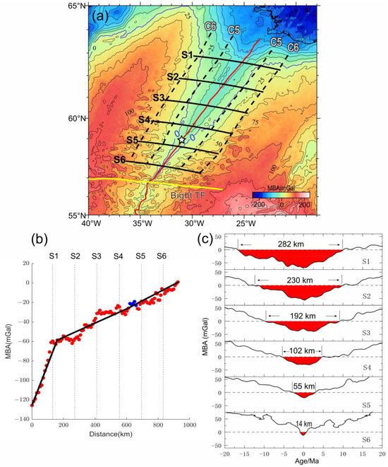 The MBA of the Reykjanes Ridge and its adjacent area ranges from −200 to 160 mGal and gradually increases from −125 mGal in the north to 0 mGal in the south along the ridge axis (Figure 4a). The MBA curve is divided into two segments: at the 0–160 km range, the MBA increases rapidly by 65 mGal with a gradient of 0.406 mGal/km; at the 160–930 km range, the MBA increases by 65 mGal with a gradient of 0.08 mGal/km (Figure 4b). The width of the MBA low-value zone (<0 mGal) narrows from 282 km in profile 1 to 14 km in profile 6 (Figure 4c). In the north of profile S2, the western side of the ridge has a wider MBA low-value zone than that of the eastern side of the ridge. In the south of profile S2, the Reykjanes Ridge has a symmetric MBA low-value zone. In profile S4, the width of the MBA low-value zone narrows rapidly. In the south of profile S6, the width of the MBA low-value zone approaches 0 km.