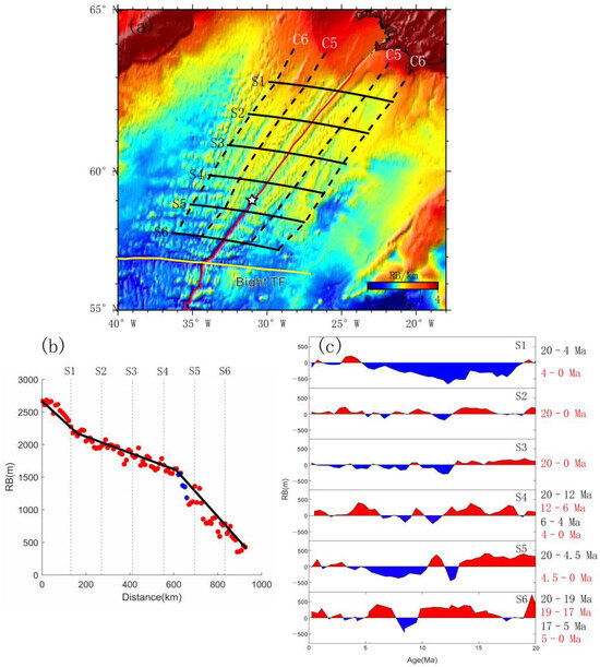 On the whole, the RB asymmetry curve exhibits an asymmetric–symmetric–asymmetric pattern from north to south during 20–5 Ma and a symmetric pattern during 5–0 Ma (Figure 5c). Profile S1 is asymmetry during 20–4 Ma and symmetry during 4–0 Ma. During 20–4 Ma, the RB of the western side of the ridge is 286 m higher than that of the eastern side. At 12 Ma, the asymmetry amplitude reaches a maximum value of 666 m. During 4–0 Ma, the RB asymmetry amplitude is −39 ± 70 m. Profiles S2 and S3 exhibit a low RB asymmetry amplitude (51 ± 101 m and −9 ± 121 m, respectively) during 20–0 Ma. During 20–12 Ma, the RB of the western side of profile S4 is 166 m lower than that of the eastern side. During 12–6 Ma and 4–0 Ma, the RB is relatively symmetry, with an asymmetry amplitude of 51 ± 101 m. During 6–4 Ma, the RB of the western side of the ridge is 284 m lower than that of the eastern side. Similar to profile S1, profile S5 is asymmetric during 20–4.5 Ma and symmetric during 4.5–0 Ma. During 20–13 Ma, the RB of the western side of the ridge is 292 m lower than that of the eastern side. During 13–10.5 Ma, the asymmetric polarity of the RB reversed twice. During 10.5–4.5 Ma, the RB of the western side of the ridge is 215 m higher than that of the eastern side. During 4.5–0 Ma, the RB is relatively symmetric, with an asymmetry amplitude of 33 ± 104 m. The RB of profile S6 is asymmetric during 17–5 Ma and symmetric during 5–0 Ma. The RB asymmetry amplitude decreases rapidly from 718 m to −16 m during 20–17 Ma. During 17–10 Ma, the RB of the western side of the ridge is 253 m lower than that of the eastern side. During 10–5 Ma, there are two RB asymmetry polarity reversals. During 5–0 Ma, the RB exhibits relative symmetry, with an asymmetry amplitude of 63 ± 124 m.