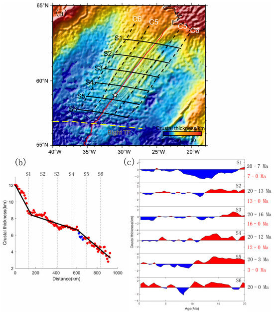 The crustal thickness asymmetry curve exhibits an asymmetric–symmetric–asymmetric pattern and from north to south during 20–10 Ma and symmetric pattern during 10–0 Ma (Figure 6c). The crustal thickness of profile S1 is asymmetric during 20–7 Ma and symmetric during 7–0 Ma. During 20–7 Ma, the crust of the western side of the ridge is 1.33 km thicker than that of the eastern side. The crustal thickness asymmetry reaches a maximum amplitude of ~2.82 km at 12 Ma. During 7–0 Ma, profile S1 has symmetric crustal thickness with an asymmetry amplitude of −0.33 ± 0.29 km. The asymmetry of the crustal thickness of profiles S2–S3 is significantly lower (−0.11 ± 0.40 km and −0.11 ± 0.63 km, respectively) than that of profile S1. During 20–12 Ma, the crustal thickness asymmetry of profile S4 became strong. The crust of the western side of the ridge is 1.01 km thinner than that of the eastern side. During 12–0 Ma, profile S4 has a symmetric crustal thickness (−0.03 ± 0.40 km). The crustal thickness of profile S5 is asymmetric during 20–3 Ma and symmetric during 3–0 Ma. The crustal thickness of the western side of the ridge is 1.32 km thinner during 20–10 Ma but 0.72 km thicker during 10–3 Ma than that of the eastern side. During 3–0 Ma, crustal thickness became symmetric, with an asymmetry amplitude of 0.15 ± 0.25 km. The crustal thickness of profile S6 shows a clear asymmetry. During 20–17.5 Ma, there are two asymmetry polarity reversals, with an asymmetry amplitude of 0.17 ± 0.76 km. Compared to the eastern side, the crust of the western side of the ridge was 1.10 km thinner during 17.5–9.5 Ma, 1.42 km thicker during 9.5–7 Ma, and 0.64 km thinner during 7–0 Ma.