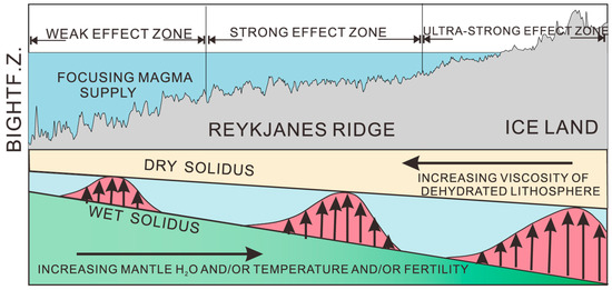 The topography and crustal structure of the Reykjanes Ridge are attributed to mantle plumes radiating outward from the Iceland hotspot [15,16,33]. Martinez and Hey [15] suggested that a low-viscosity melt zone persists beneath the Reykjanes Ridge, which results in the propagation of an upwelling instability cell in the shallow buoyant mantle along the ridge axis forming the V-shaped topography (Figure 7). Our results show that the ultra-strong effect zone has a thick crust (>8 km), a wide low MBA zone and a high RB (>2000 m), indicating that it has adequate mantle melt supply, a wide shallow melting zone and an isostatic compensation lithosphere. In addition, the RB and crustal thickness have large variation gradients along the axis, which may reflect the rapid decrease in the amount of mantle material. We suggest that the Iceland plume provides an excess mantle melt material for the ultra-strong effect zone, which exceeds the consumption of mantle upwelling, thus forming a wider mantle melting zone. Nichols et al. [34] measured the water contents of basaltic glasses along the Reykjanes Ridge and Iceland and found that the concentration of water increased from 165 ppm at the southern end of the Reykjanes Ridge to between 620 and 920 ppm beneath Iceland. Such a rise in the mantle water content increases the degree of melting by up to 10%. Sufficient melt and a high melting degree reduce the mantle viscosity and enhance the buoyancy of the mantle upwelling instability cell, resulting in a faster vertical advection rate. In addition, thermal erosion can thin the thickness of the lithosphere lid so that the resistance of mantle upwelling instability cell is weakened. These obviously enhance the mantle upwelling, resulting in a large amount of mantle melt material eruption. The total amount of mantle melts and mantle volatiles decrease rapidly along the Rekjanes Ridge axis.