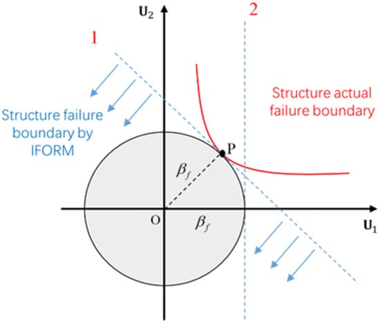 where is the PDF of the standard normal distribution. Rosenblatt transformation converts the probability model in the real physical parameter space into the U space; the design point is chosen as the closest point on the boundary to the origin, where coordinates in the U space can be expressed as . As shown in Figure 1, according to the FORM, the structural failure probability can be simply estimated as [24]: