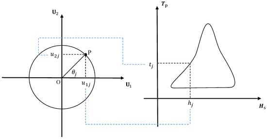 IFORM is the inverse method of the first-order reliability method (FORM). This method approximately calculates the long-term response extreme value of a complex structure through short-term response analysis [23], such as the 3 h short-term response extreme value. It is assumed that the short-term sea state is a stationary random process, and the structural response extreme value is used as the analysis variable. Taking significant wave height Hs and spectral peak period Tp as an example, the cumulative distribution function (CDF) of R3h is [24]: