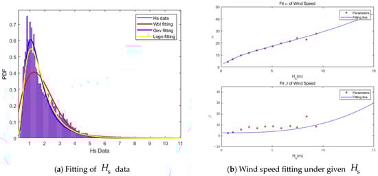 The environmental data used in this study are from a site in the South China Sea. According to Equation (15), the probability model of Hs is established first, as shown in Figure 3a. A comparison of “Weibull (Wbl) fitting”, “Generalized extreme value (Gev) fitting” and “Lognormal (Logn) fitting” shows the lognormal model has the best fitting results, especially at large wave heights. So, the lognormal distribution is the marginal distribution of Hs. The Weibull distribution is selected as the conditional distribution of V under Hs, and the Weibull distribution is selected as the conditional distribution of U under V and Hs.