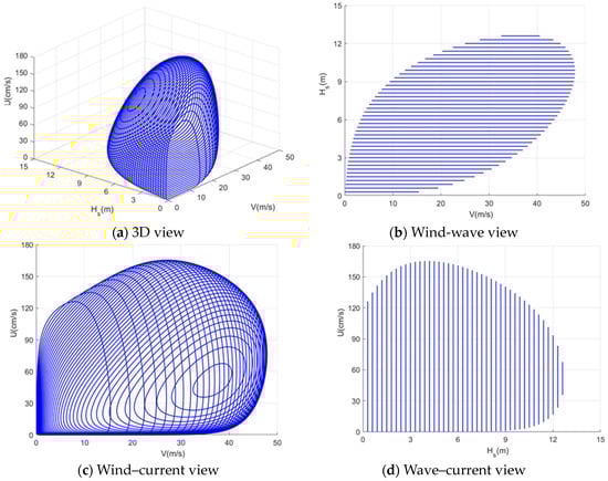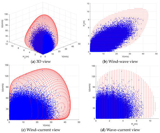 Inverse Rosenblatt transformation is used to convert the scatter points from the U space to the environmental parameter space, and a wind–wave–current 3D EC is constructed, as shown in Figure 4. The red lines are the IFORM contour, and the origin data are in blue. It can be seen from Figure 4a that the contour surface and scatter point configuration are well matched. Compared with existing contours [24,27,28], Figure 4b shows that the correlation between Hs and V is relatively high, as shown in Figure 4c,d; the correlation between both U and Hs and U and Hs is low, respectively.