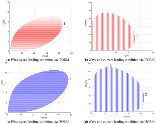 The single-parameter leading conditions include wind, wave and current, which are denoted as condition point No. 1, 2 and 3 in Figure 7, respectively. Figure 7a,b show the leading condition points No. 1, 2 and 3 by using IFORM contour, and Figure 7c,d show those by using ISORM contour.