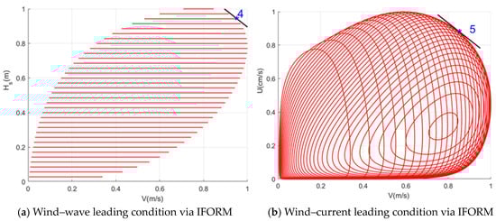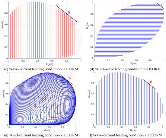 The two parameter leading conditions include wind–wave led, wind–current led and wave–current led, which are denoted as condition points No. 4, 5, and 6. For the 3D contours, a straight line with a slope of 1 was drawn on the corresponding two-dimensional perspective view, and the intersection point with the contour surface is the leading condition point. In order to facilitate observation, the contour is normalized. Figure 8 shows the two parameter leading conditions on the contour of IFORM and ISORM.