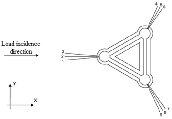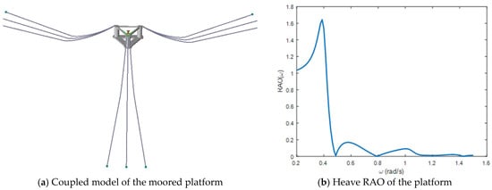 A three-column semi-submersible FOWT in the South China Sea was used as an example. The mooring system of the platform consists of nine identical mooring lines. Three mooring lines are distributed on each of the three columns. Overall, it has a 3 × 3 symmetrical layout, and the nine mooring lines are named clockwise (as 1–9). The first line is the lower line in the load incidence direction, as shown in Figure 9, and its main particulars are listed in Table 5. The non-linear time-domain dynamic response of the platform is calculated using the coupled model in Figure 10a, and the heave RAOs are shown in Figure 10b.