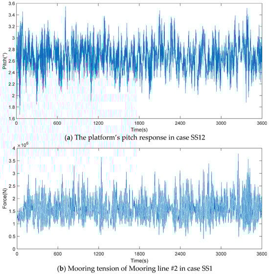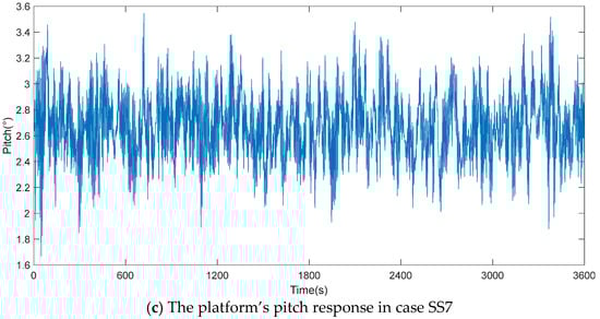 As for the most extreme conditions, SS7, which is the most frequently selected working condition as well, the pitch of the platform is over 10°, which implies that the conservative estimate of SS7 may be too large. The tension forces are demonstrated in Figure 11c; the minimum breakage load (MBL) of the mooring line is 12,690 kN, and the maximum tension of mooring line #2 in case SS7 is within the safe range.