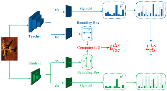 Specifically, we obtain the information of detection boxes from the teacher model and student model. For a given input sample x, the predicted boxes on the i-th feature map of the teacher network and student network are denoted as and , respectively. Then, the IoU loss between them, denoted as , can be calculated, and the localization loss can be expressed as Equation (10):