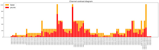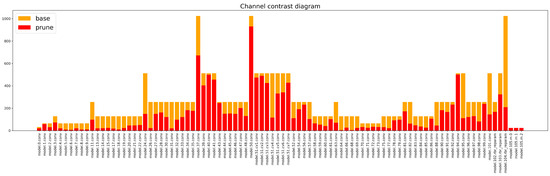 In terms of model parameters, the KD 4× compressed model reduced the parameter count by 23.5 M, the model size by 46.3 MB, and the computational load by 12.5 GFLOPs. The comparison of the number of channels per layer between the compressed model and the baseline model is shown in Figure 10. Similarly, most of the channels underwent various degrees of pruning.